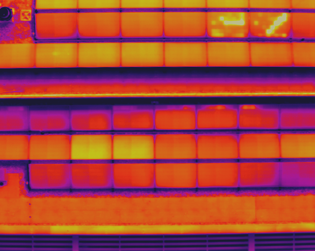 Hieronder is een voorbeeld te zien van zonnepanelen waar op het eerste oog niets mis mee is (links). Echter wanneer we naar het thermisch beeld (rechts) kijken is duidelijk te zien dat 2 panelen niet werken (gele kleur) en 2 panelen ernstig beschadigd zijn (vele gele kleur). Deze panelen laten een andere temperatuur zien dan de andere panelen.