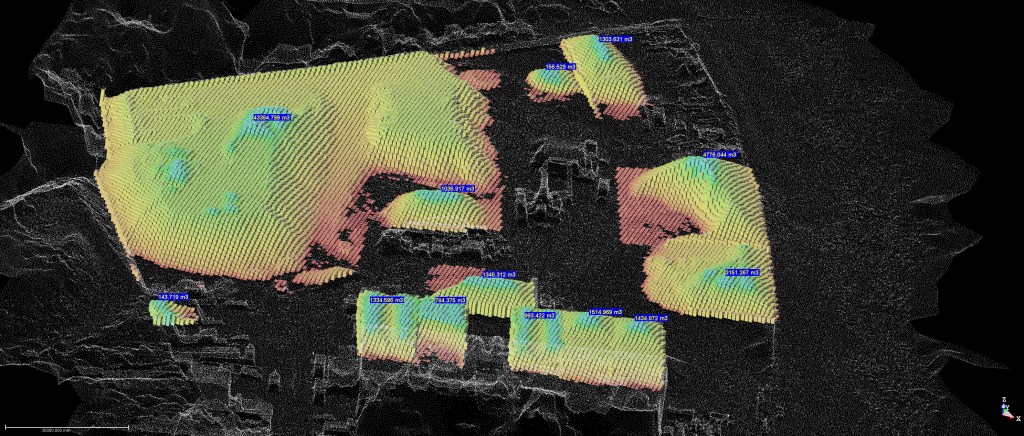 In opdracht van Nidim hebben wij een Mapping klus uitgevoerd om grote voorraden zand in kaart te brengen. Dit houd in dat we een bepaalde route vliegen wat lijkt op een raster. Deze vlucht vliegen we met een RKT (Real Time Kinematic) verbinding, wat nodig is om de nauwkeurigheid van de data sterk te verhogen. Na de vlucht worden de foto’s ingeladen in de speciale software die hier een 3d puntenwolk van maakt. Aan de hand hiervan kan er zeer accuraat de volumes berekend worden. Het resultaat ziet u hiernaast.